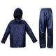 Marinblått vattentätt regnställ med fickor i byxa och jacka. Knappar i ärmslut och benslut.